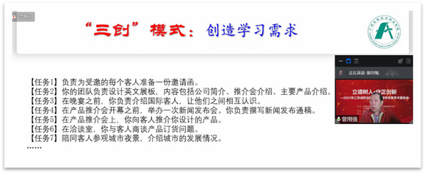3月30日下午,江苏省职业院校英语教学改革学术报告会在“云端”召开。会议以“立德树人·守正创新”为主题,邀请了广东省外语艺术职业学院校长曾用强教授和暨南大学外国语学院院长赵雯教授作主旨报告,会议由江苏省高等学校外国语教学研究会高职分会、江苏省职业院校应用外语研究会主办、我校国际教育学院承办。国际教育学院全体外语教师和全省其它高职院校近300名教师参加了报告会。本次报告会不仅是职业院校外语教学改革从课程思政、“三创思维”赋能外语课堂教学的一次尝试,同时也是我院高职英语项目化教学改革大讨论系列活动之一。报告会由江苏省职业院校外语研究会会长、国际教育学院院长李恩亮主持会议。