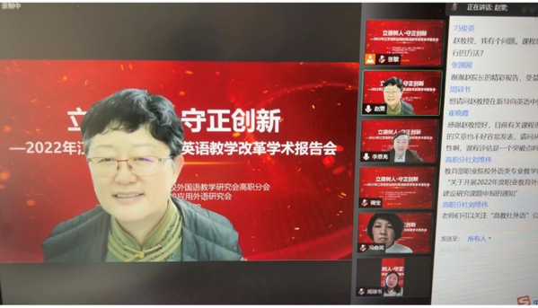 赵雯教授作了题为《“双核驱动”的高职英语课程思政》的主旨报告。报告从政策层面、理论建构层面、教材建设层面围绕政治认同、家国情怀、文化素养和职业道德等教学内容重点和学科核心素养培养进行论述,对高职英语的课程思政具有启示与借鉴作用。报告后赵教授与老师们进行了亲切的线上互动,为老师们答疑解惑。