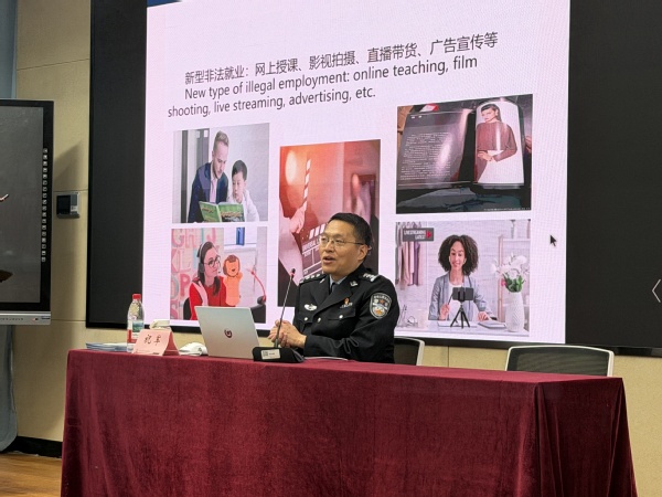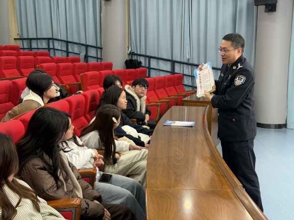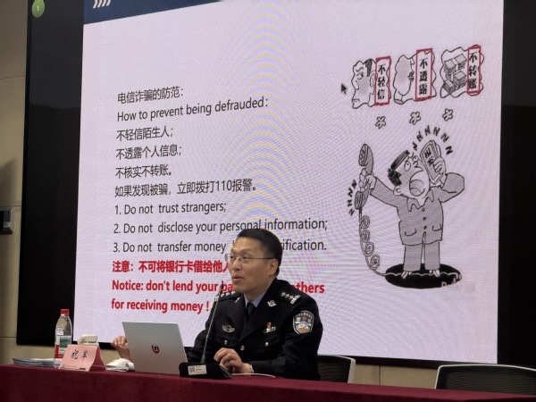 祝军结合多年工作经验,围绕《中华人民共和国出境入境管理法》《外国人停留居留管理规定》等法律法规,为留学生们系统讲解了签证办理、居留许可、住宿登记、宗教管理规定、非法就业界定等关键内容。他还通过典型案例剖析,提醒同学们注意防范电信诈骗、交通出行安全以及日常生活中的各类风险,引导大家自觉遵纪守法,提高安全防范意识。讲座结束后,现场还向留学生发放了防诈骗宣传册和交通安全出行宣传册,帮助同学们更直观地掌握安全知识。