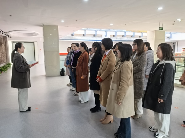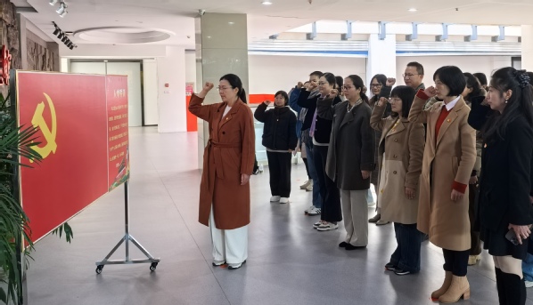 在纪念馆讲解员的引导下,全体人员沿着历史的轨迹,通过详实的文献资料、珍贵实物与复原场景,全面回顾了我党早期杰出领导人、首任中央监察委员会主席王荷波同志的光辉一生。从领导工人运动的坚定身影,到主持纪检监察工作的清廉坚守;从狱中斗争的坚贞不屈,到“加强对子女革命教育”的临终遗愿,王荷波同志的革命气节与崇高精神深深打动了在场的每一位老师。参观结束后,全体党员在纪念馆大厅前整齐列队,在党总支副书记张敏的带领下重温入党誓词。铿锵誓言回荡在纪念馆内,彰显了党员们不忘初心、牢记使命的坚定信念。