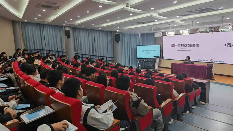 2025年11月12日,本校新东方学院在竞慧楼301报告厅成功举办了大学英语四六级备考讲座。讲座特邀新东方(南京)学校的明星讲师黄雅屏老师担任主讲,吸引了众多学生踊跃参与。