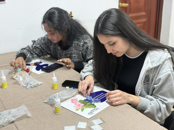 活动现场氛围热烈而有序,志愿者们结合精心准备的图文资料与实物瓷片,向留学生们生动讲解了青花瓷“白底青花、素净雅致”的美学特质,其从元代兴起、明清鼎盛的历史渊源,以及青花图案中蕴含的吉祥寓意与文化内涵。讲解结束后,留学生们迫不及待地投入实践,在志愿者的指导下,仔细观察瓷片纹理、搭配色彩层次、拼接青花贴画,在一粘一贴之间,亲身感受青花瓷跨越千年的艺术张力,体悟传统工艺背后的匠心与智慧,真切触摸中华文化的璀璨脉络