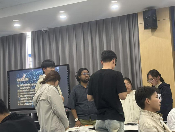 活动伊始,Giliam老师以“喜欢观看的电影类型”为切入点,引导学生交流观影体验,并介绍了不同类型电影及其特点,以及观影时的情感反应,激发了同学们的参与热情。随后,围绕各类电影的基本内容与相关词汇展开讲解,并通过小组活动进行巩固练习,帮助学生在互动中掌握词汇、提升表达能力。同时介绍了电影拍摄中的镜头语言及演员化妆等相关内容,拓展了学生的知识面,提升了真实情境下的语言应用能力。